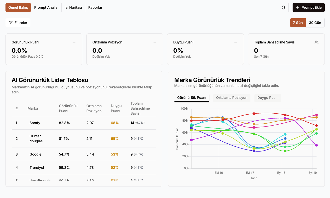 Marka Görünürlüğünü İzleyin: ChatGPT, Google AI Overviews ve Perplexity gibi önde gelen yapay zekâ motorlarında markanızın ne kadar yer aldığını düzenli olarak takip edin.