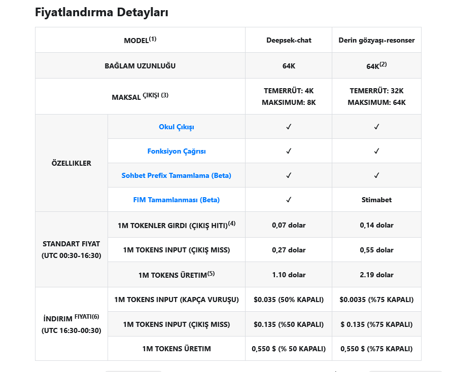 Fiyatlandırma: İki modele sahip. Biri günlük ve genel kullanım için DeepSeek-Chat. Diğeri daha kapsamlı kullanımlar için DeepSeek-Reasoner. Çince veya İngilizce bir kelime, bir sayı veya bir sembol jeton (token) olarak sayılıyor. Daha önce konuştuğunuz bir konuya daha az fiyat ödüyorsunuz. Diğer yandan Türkiye saatiyle 19:30-03:30 arası fiyatlar daha ucuz. Aşağıdaki tablodan fiyatlandırmayı inceleyebilirsiniz.
