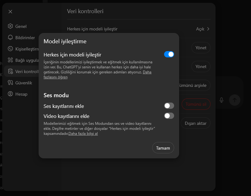 Ayarlar > Veri Kontrolleri > Herkes İçin Modeli İyileştir seçeneğini devre dışı bırakın.